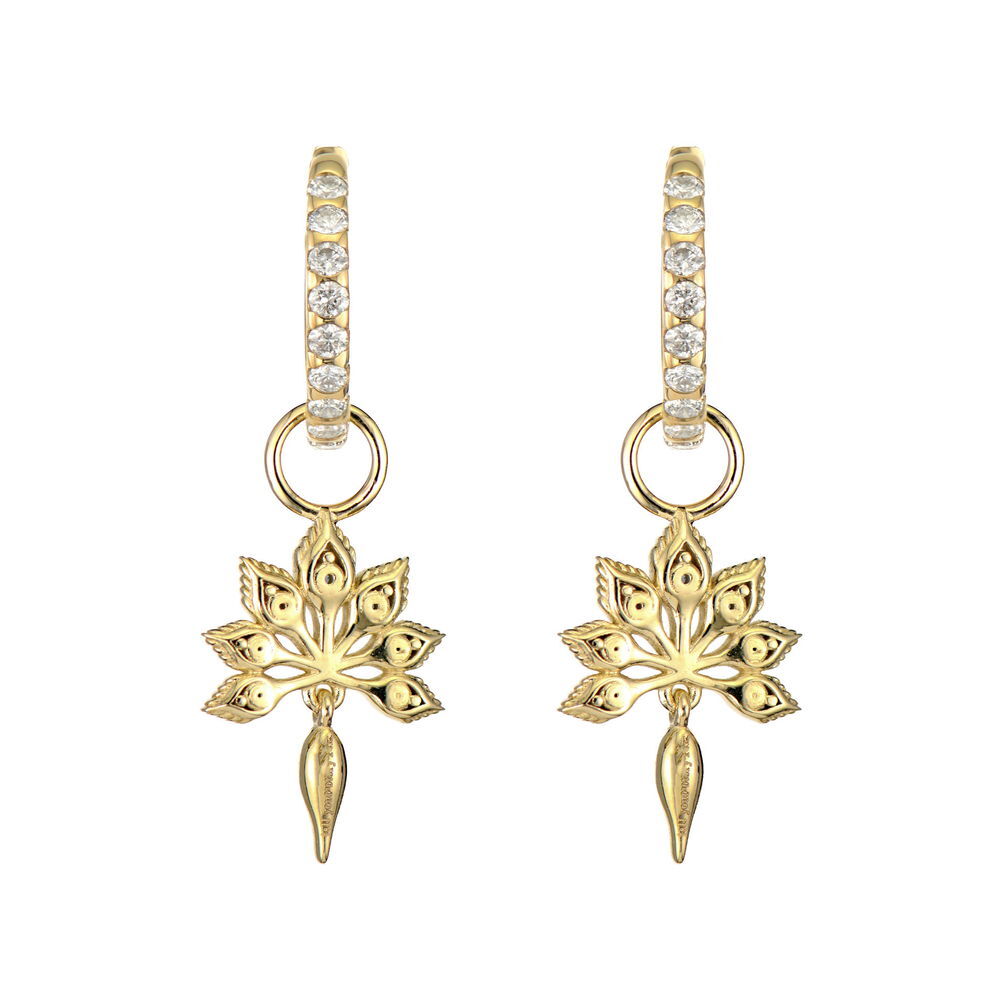 A miniature peacock in 14K yellow gold features blue sapphires and diamond details. Add a symbol of beauty and renewal to your ear story when attached to Three Stories hoops, or add a bale for necklace wear. Hoops sold separately.