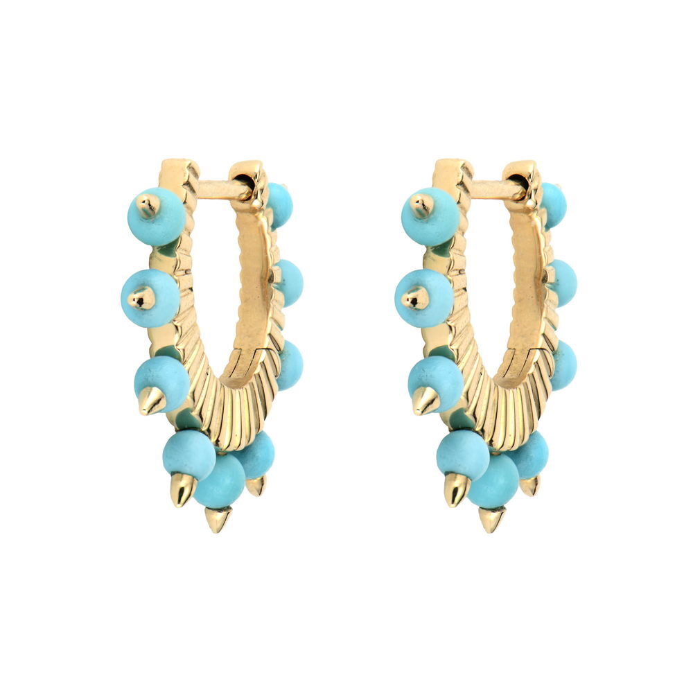Turquoise beads alternate with gold spikes around a pleated fan-shaped hoop in 14K yellow gold. This statement piece brings bohemian glamour and sun-ray inspired detailing to your ear. Perfect for making a bold impact solo or paired with your Three Stories ear stack.