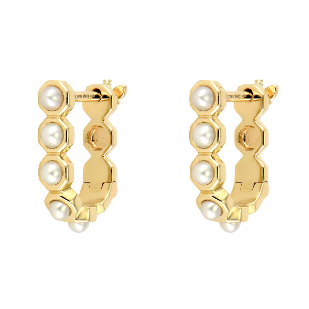 Lustrous white pearls adorn the front of this honeycomb-shaped hoop, while the back reveals a delicate 14K yellow gold bee. Double-sided design brings regal elegance and natural beauty to your ear.
