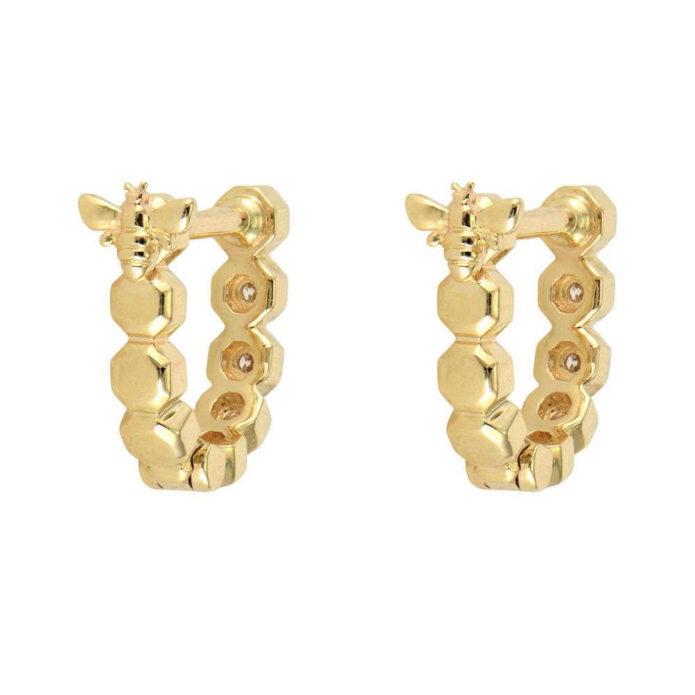Diamonds sparkle on the front of this honeycomb-shaped huggie hoop, while a tiny bee adorns the back in 14K yellow gold. This double-sided piece brings regal sweetness to your ear stack.