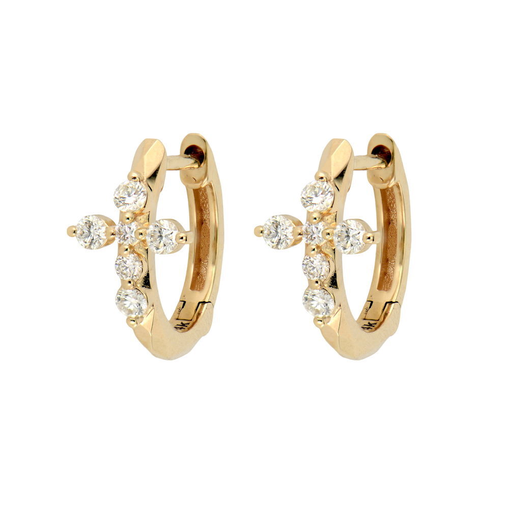 A diamond-studded cross sits on the outside of this small huggie hoop in 14K yellow gold. Faith and sparkle unite in this meaningful piece that adds dimension and elegance to your ear.