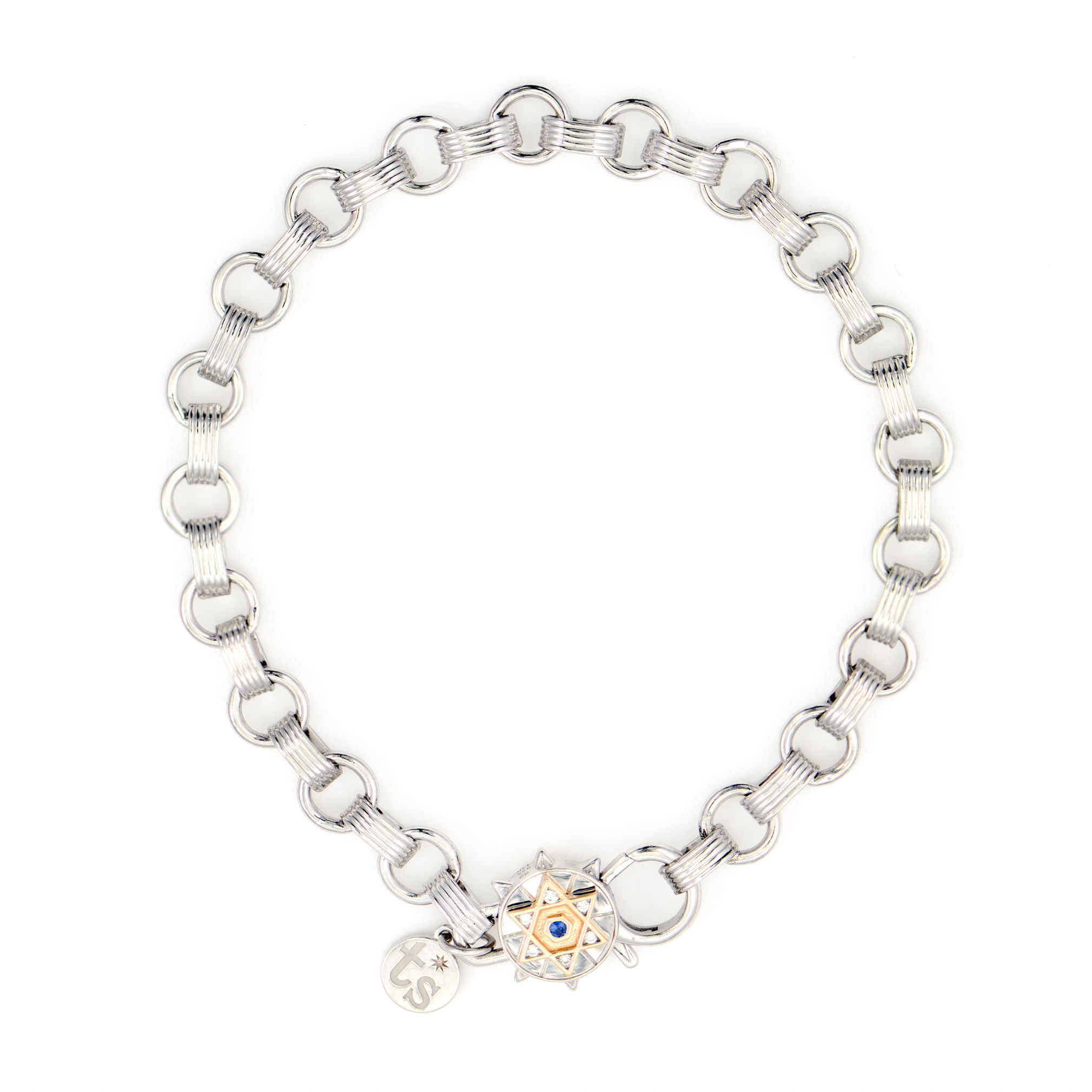 The clasp commands attention - a 14K yellow gold hamsa hand with diamonds connects to a Star of David featuring blue sapphires, gold, and diamonds on a sterling silver clasp. This spiritually meaningful closure sits beautifully on a sleek sterling silver chain bracelet. Sacred symbols unite at your wrist. Size 7.