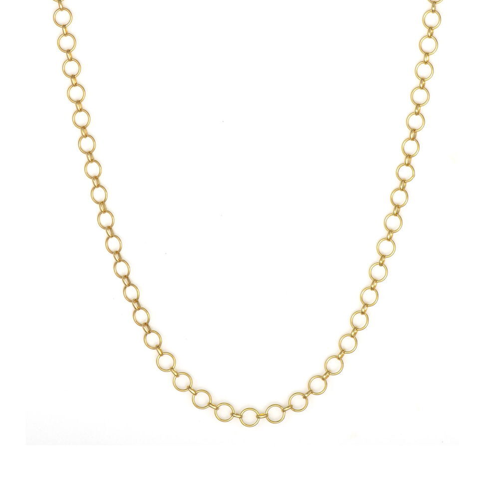 A Symphony of Circles in GoldThe Classic Faceted Round Loopy Chain in 14K yellow gold is a playful twist on timeless elegance. At 16 inches, this necklace drapes beautifully at the collarbone, creating a focal point of subtle intrigue.What sets this chain apart is its rhythmic pattern of alternating tiny and medium round loops. This variation in size creates a dynamic visual texture, catching the light in a mesmerizing dance of golden circles.The high polish finish amplifies the chain's brilliance, each link reflecting light with a warm, golden glow. Despite its delicate appearance, this loopy chain is crafted for everyday wear, marrying durability with delicacy.Perfect for layering or wearing solo, this chain adds a touch of whimsy to any outfit. It's not just a necklace - it's a golden melody of circles, singing a song of style around your neck.