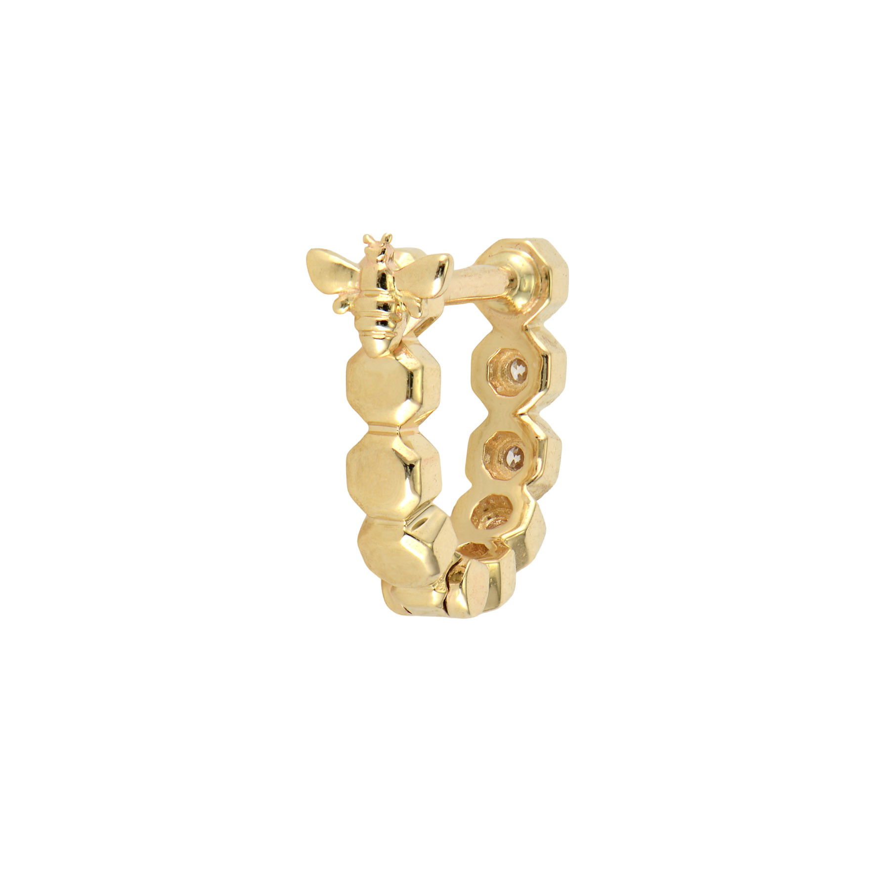 Diamonds sparkle on the front of this honeycomb-shaped huggie hoop, while a tiny bee adorns the back in 14K yellow gold. This double-sided piece brings regal sweetness to your ear stack.