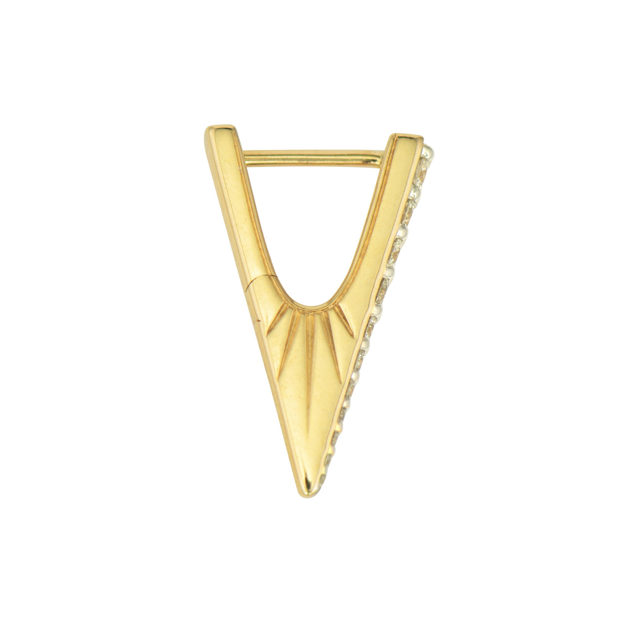 The Small Diamond V Hoop Earring brings edgy elegance in a compact design. Crafted in 14K gold, this huggie-style hoop features the distinctive V shape adorned with sparkling diamonds and detailed engraved sides that add extra visual interest. The smaller scale offers all the impact of the elongated version in a more subtle, everyday-friendly size.The edgy V silhouette creates a modern geometric aesthetic while the huggie style ensures comfortable, secure wear. The engraved detailing on the sides adds an artisanal touch that catches the light beautifully alongside the diamonds. Perfect for those who love the bold V design but prefer a more understated scale. Hoops sold as singles.