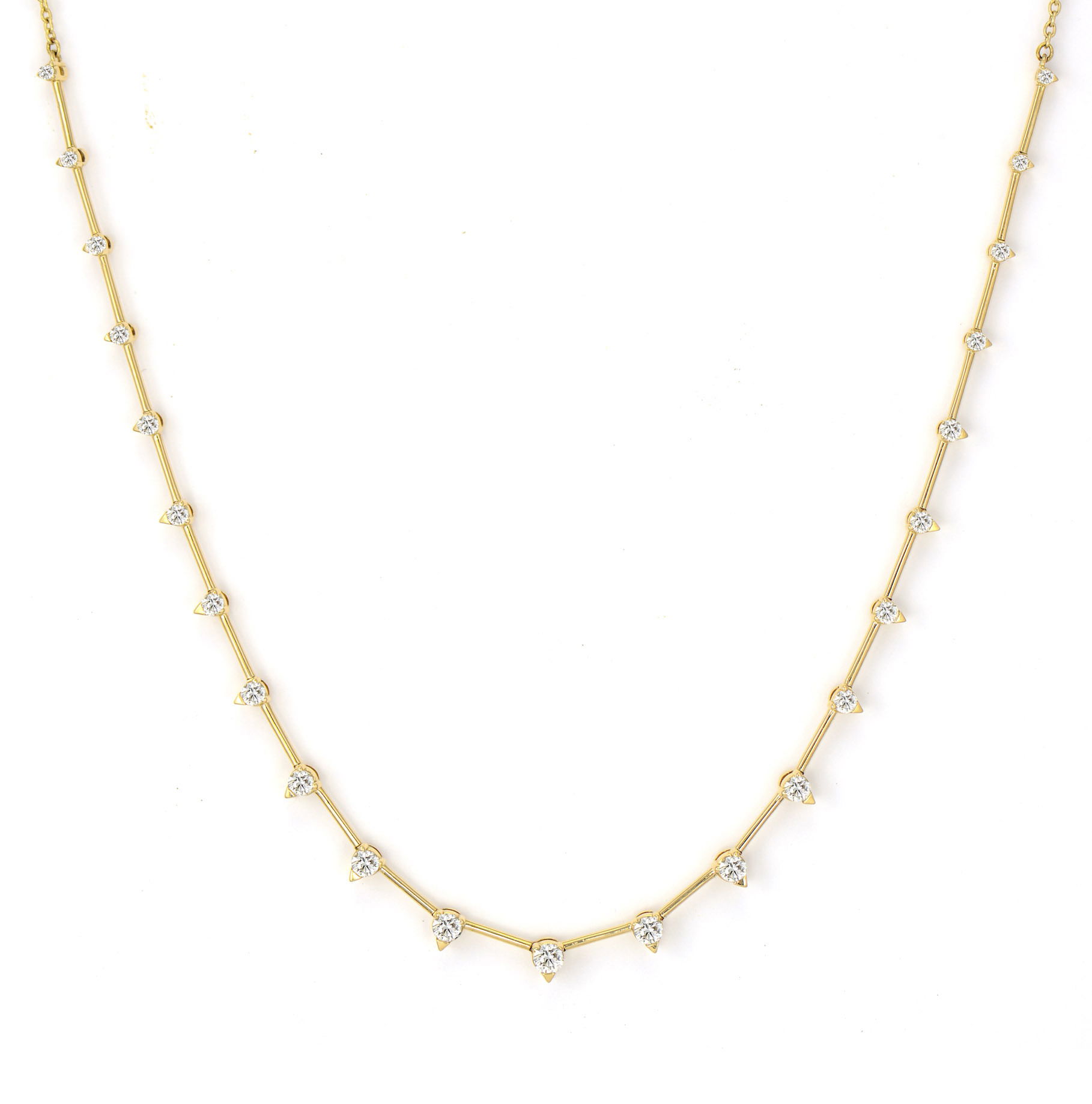 Elegant diamonds graduate in size along sleek bars in this stunning 14K yellow gold necklace. Sophisticated sparkle that elevates any look, perfect for special occasions or everyday luxury. A timeless piece that transitions effortlessly from day to night. 16 Inches.
