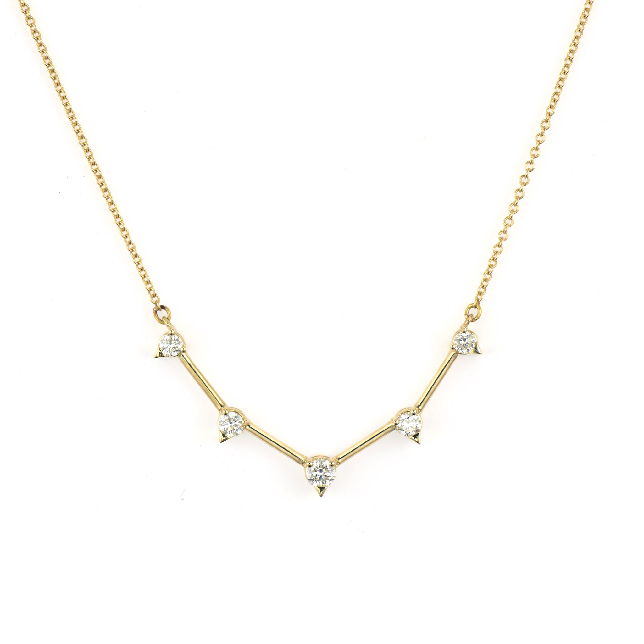 Five diamonds gracefully graduate in size along sleek bars in this refined 14K yellow gold necklace. Simple sophistication that elevates any look effortlessly. Perfect for everyday elegance or special occasions. 16 Inches.