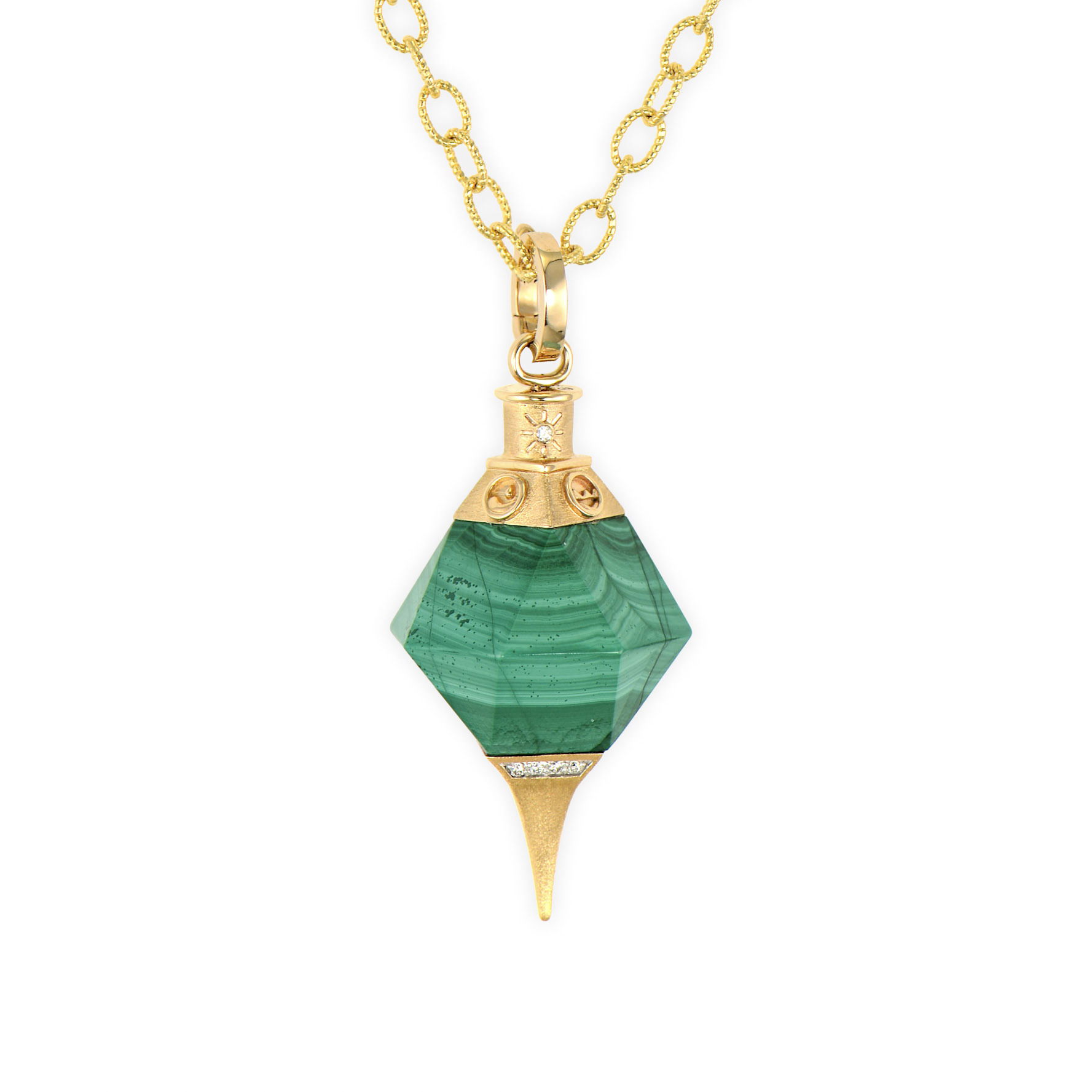A carved malachite cone creates this powerful pendulum pendant. Malachite is known as the stone of transformation, absorbing negative energies and pollutants while promoting emotional healing and spiritual growth. This mystical piece brings balance and protective energy to your divination practice. Chain sold separately.