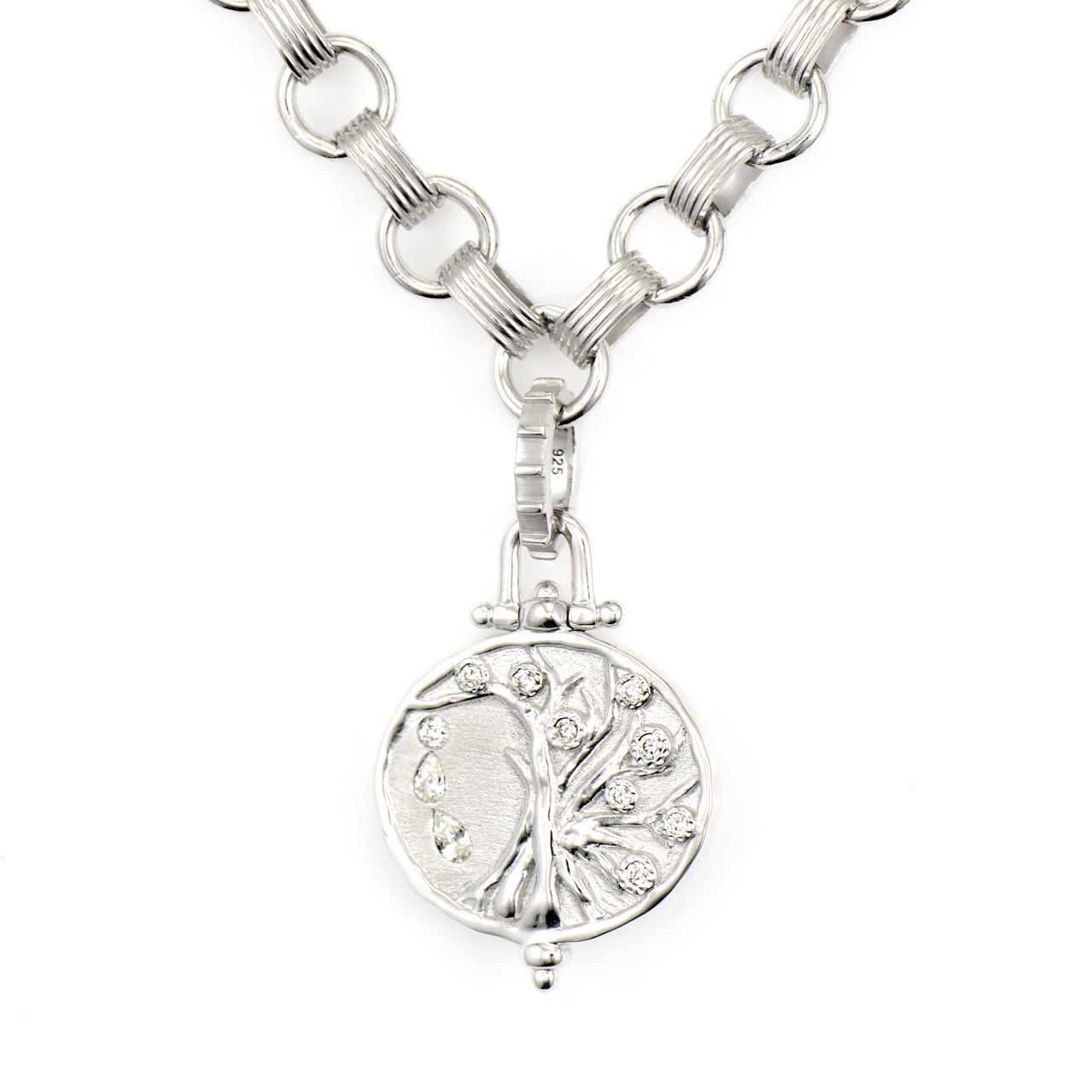 The tree of life represents beauty, hope and strength, each branch reaching up and growing toward the sparkling sky. Part of our 5th anniversary sterling silver collection, this reimagined Engraved Tree of Life Pendant features stunning sterling silver with a diamond-adorned engraved tree on the front, while the back showcases an engraved tree with room to personalize your own family tree. This pendant can be attached to a Three Stories chain necklace or bracelet. Pendant and chain sold separately; openable pendant bale included.