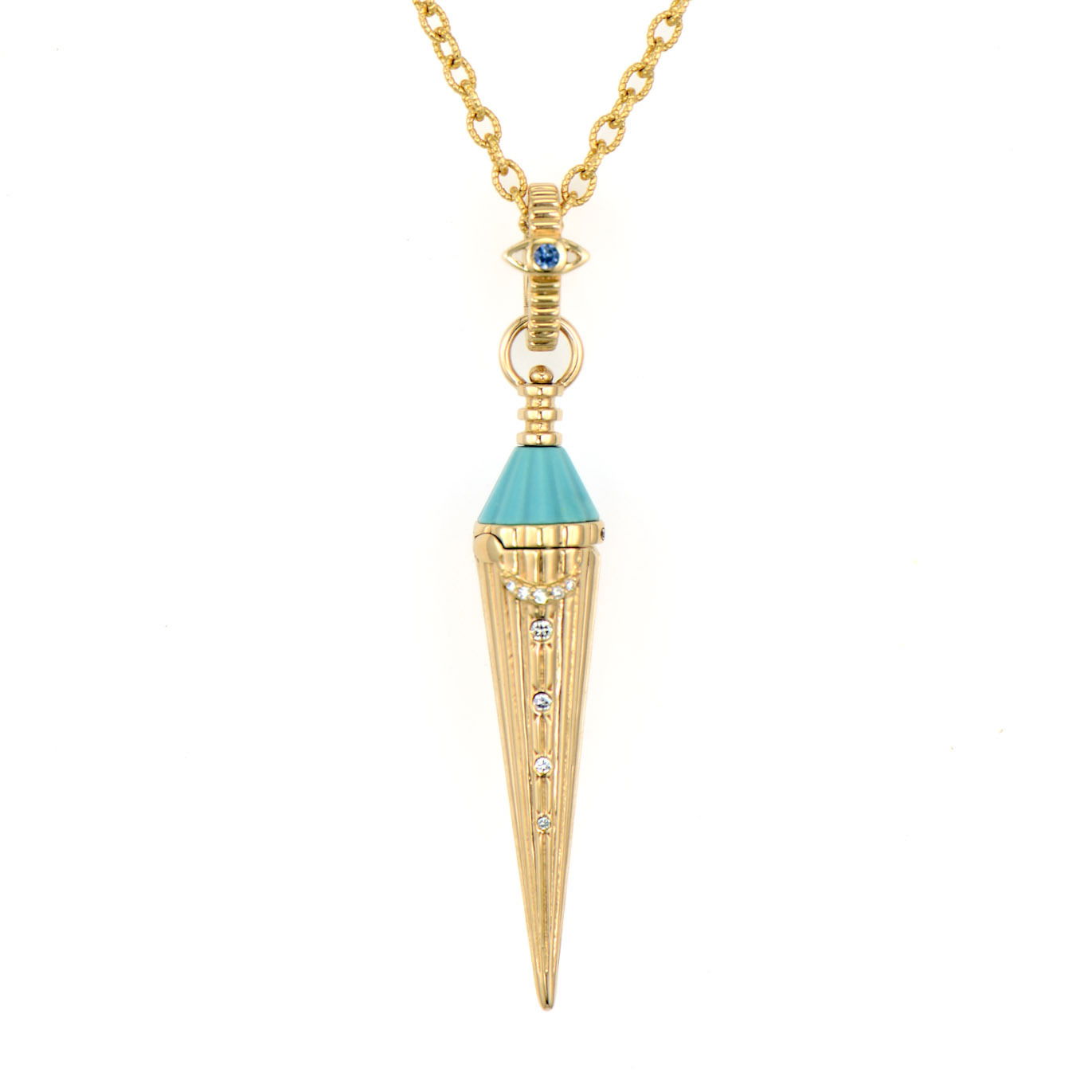 A carved turquoise cone adorned with sapphires and diamonds opens to reveal a secret chamber in this mystical 14K yellow gold pendulum pendant. Both beautiful and functional, this piece brings divination energy and hidden treasures to your collection. Chain sold separately.