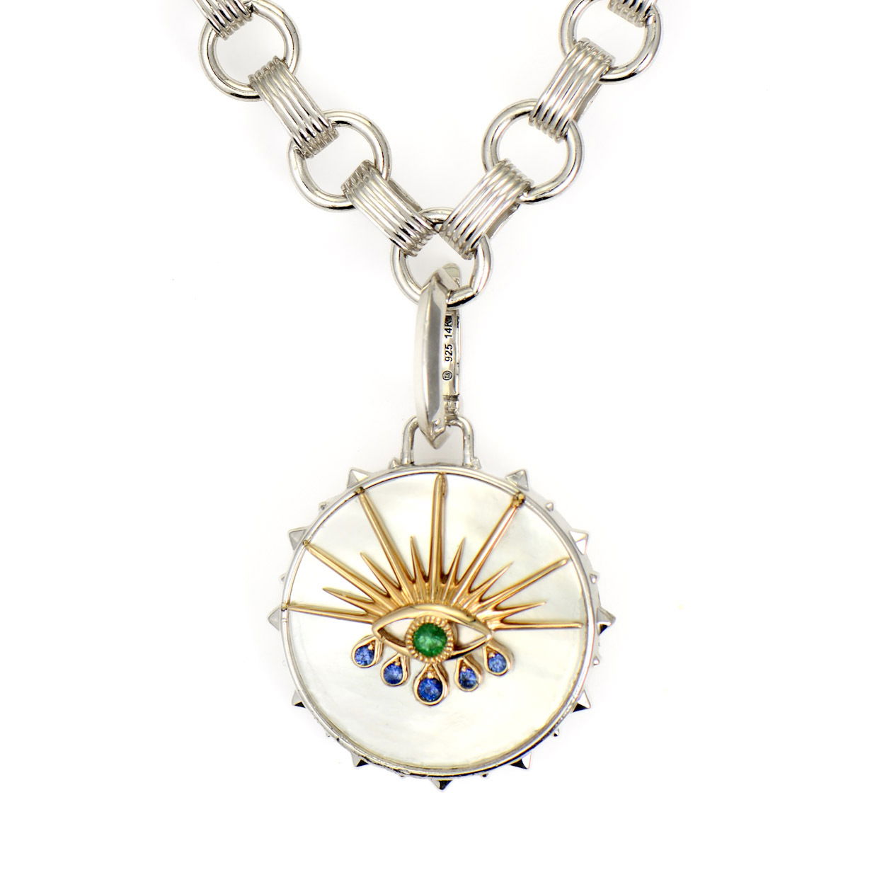 Mother of pearl tablet features a protective evil eye in 14K yellow gold with emerald and blue sapphires on one side, while a sterling silver lotus flower blooms on the reverse. This meaningful double-sided pendant with diamond accents is spiritually beautiful. Chain sold separately.