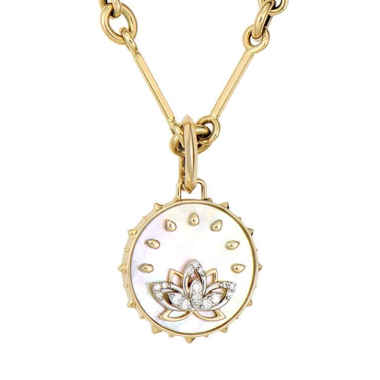 A diamond-studded lotus flower blooms on mother of pearl on one side, while the flip reveals a protective evil eye in 14K yellow gold with ruby and emerald accents over mother of pearl. This double-sided tablet pendant combines spiritual beauty with meaningful protection. Crafted in 14K yellow gold with diamonds, it's a powerful symbol of enlightenment and safety. Chain sold separately.