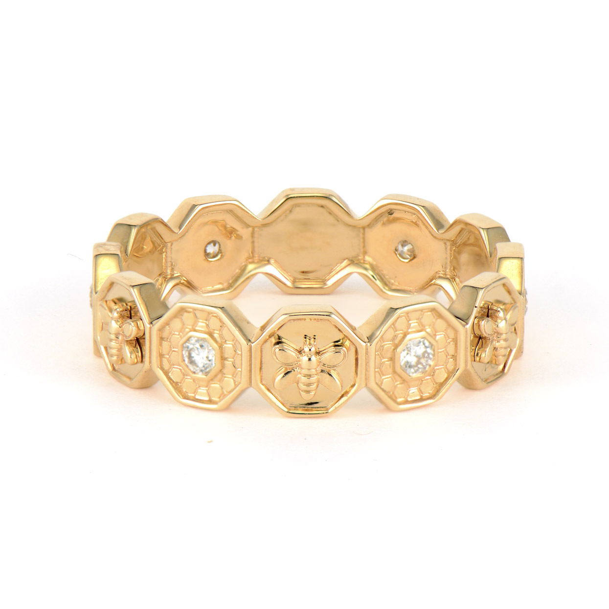 Diamonds sparkle within a honeycomb-shaped band adorned with engraved bees in 14K yellow gold. Regal and powerful, this piece celebrates queen bee energy. Perfect for stacking or making a solo statement on your finger. Size 7.