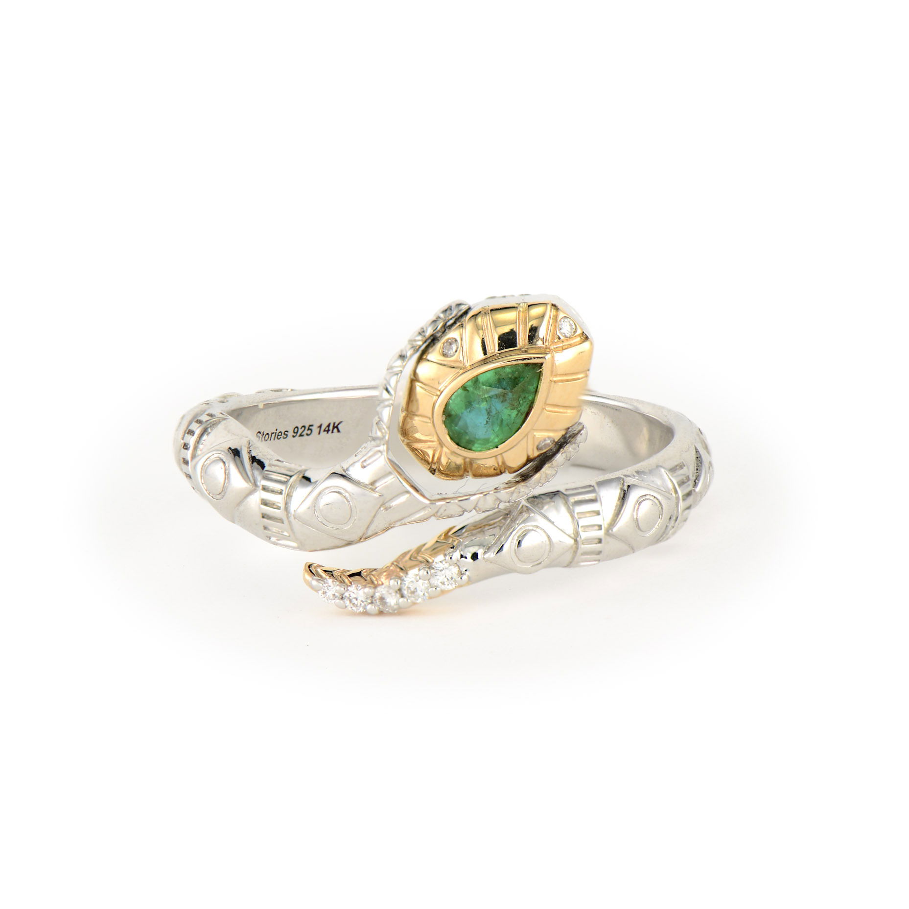 A coiled rattlesnake wraps around your finger with a flipping head that reveals two distinct looks. One side features 14K yellow gold with emeralds and diamonds, while the flip side showcases sterling silver with blue sapphires and diamonds. Transformation and power in one versatile ring. Size 7.